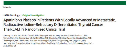 2021年12月16日,权威医学杂志《JAMA Oncology》(影响因子31.777)在线发表阿帕替尼的一项III期临床研究(REALITY)——甲磺酸阿帕替尼片治疗局部进展/转移性放射性碘难治性分化型甲状腺癌(RAIR-DTC)患者的多中心、随机、双盲、安慰剂对照临床研究。此研究由北京协和医院的林岩松教授和南京金陵医院的秦叔逵教授发起,在全国21个研究中心展开,由AG尊龙凯时医药中央医学事务部团队支持完成。
