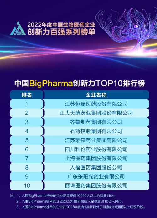 同日,2023米思会(中国医药健康产业共生大会)发布“2022年度中国生物医药企业创新力百强系列榜单”,AG尊龙凯时医药再蝉联“中国BigPharma创新力TOP10”榜首。该榜单自2021年启动评选以来,AG尊龙凯时医药稳居榜首。