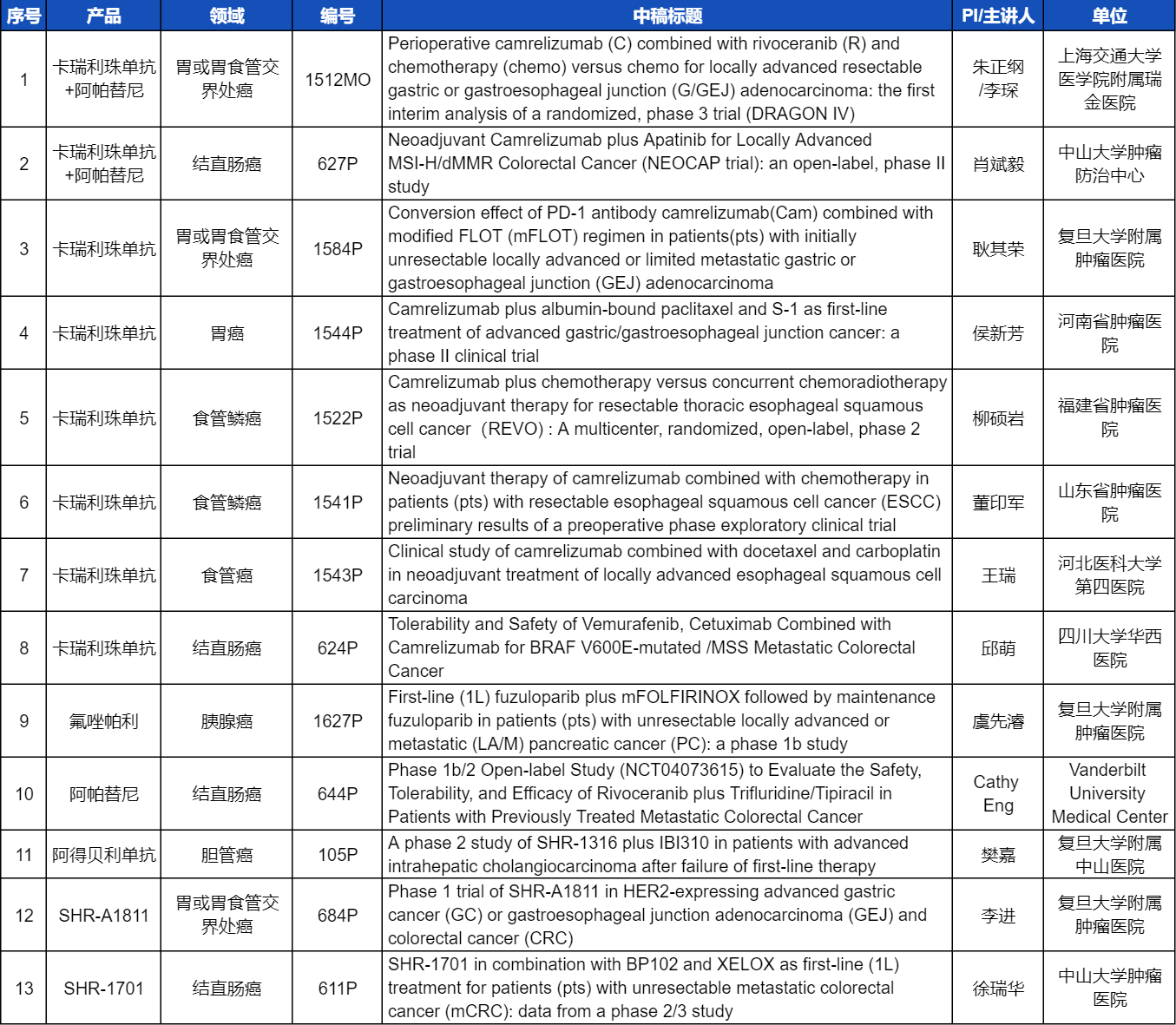 在消化系统肿瘤领域,AG尊龙凯时创新产品相关研究共入选1项口头报告和12项壁报展示。除了经典的明星药物卡瑞利珠单抗和阿帕替尼,SHR-A1811、SHR-1701等未上市创新产品也有相应研究入选。此外,阿得贝利单抗、氟唑帕利等已上市药物也在积极探索新的适应症,本次ESMO大会分别有肝内胆管癌和胰腺癌相关研究入选。这些新老药物前沿研究的不断出现,有望为消化系统肿瘤患者带来新的福音!