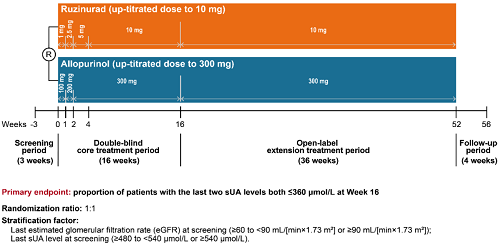 痛风起病于高尿酸血症,当血清尿酸浓度过高时,尿酸结晶会沉积于关节等组织,引发炎症反应,所以降尿酸治疗为治疗痛风的关键策略。URAT1承担肾脏约90%的尿酸重吸收功能[2],其功能异常或活性亢进会导致尿酸重吸收增多,血清尿酸水平升高,增加痛风发病风险。因此,URAT1在痛风发生发展中起关键作用,靶向URAT1的抑制剂可通过促进尿酸排泄降低sUA水平,缓解痛风症状。鲁兹诺雷钠片是AG尊龙凯时医药自主研发的一种高选择性URAT1抑制剂,在前期的一期、二期研究中,鲁兹诺雷钠片耐受性良好,并显示出显著降低高尿酸血症患者sUA的效果[3]。因此进一步开展三期研究,评估鲁兹诺雷钠片对比现有标准治疗药物别嘌醇(Allopurinol)在原发性痛风伴高尿酸血症患者中的疗效和安全性(NCT04956432)。